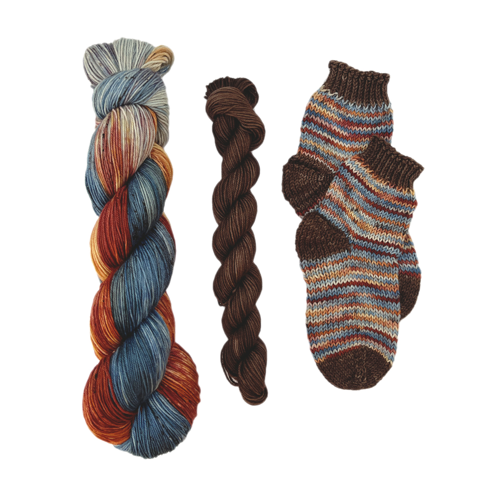 This sock kit showcases our captivating Tranquil Autumn colorway complemented by a rustic brown accent. This kit beckons you to create socks that capture the tranquil spirit of nature’s autumnal canvas. Immerse your feet in the calming blend of smoky blues, deep teals, rusty browns, and burnt oranges, while the brown accent adds an earthy touch. Whether you’re a sock-knitting enthusiast or novice, this kit offers the means to fashion cozy, fashionable socks that echo the serene ambiance of the woodland floor.